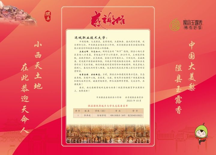 近日,中共隰县县委社会工作部、共青团隰县委员会向我校发来感谢信,对我校信创学院网络工程技术(本科)2509班李卓欣同学在“两节”期间主动放弃休假、投身家乡小西天景区志愿服务的突出表现给予高度评价。面对假期客流高峰,李卓欣同学坚守秩序维护、应急救助、咨询引导等岗位,以真诚奉献展现了新时代青年的责任担当,为提升游客体验、助力地方发展贡献了青春力量。